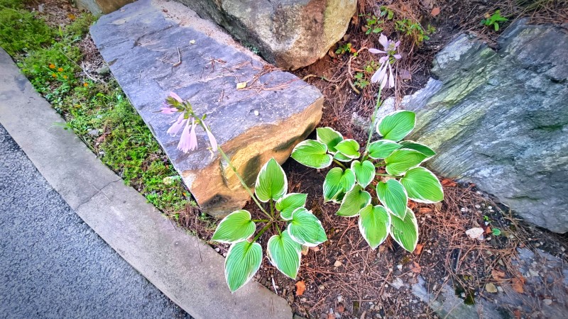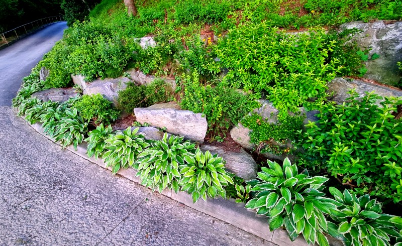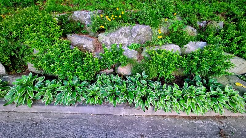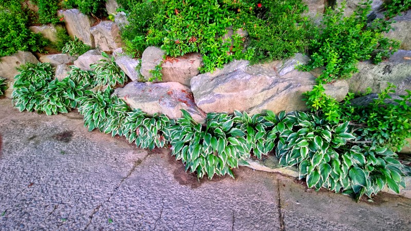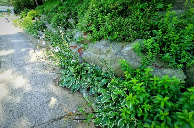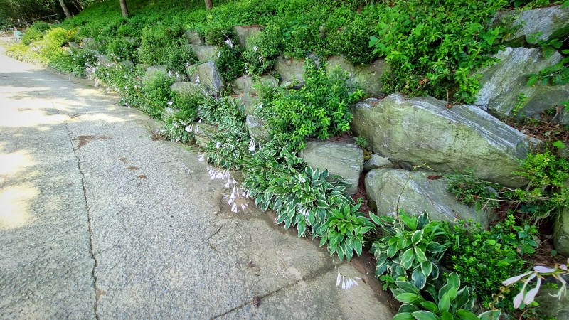 바위 사이로 연산홍과 옥잠화, 무늬비비추가 섞여있는 화단입니다.